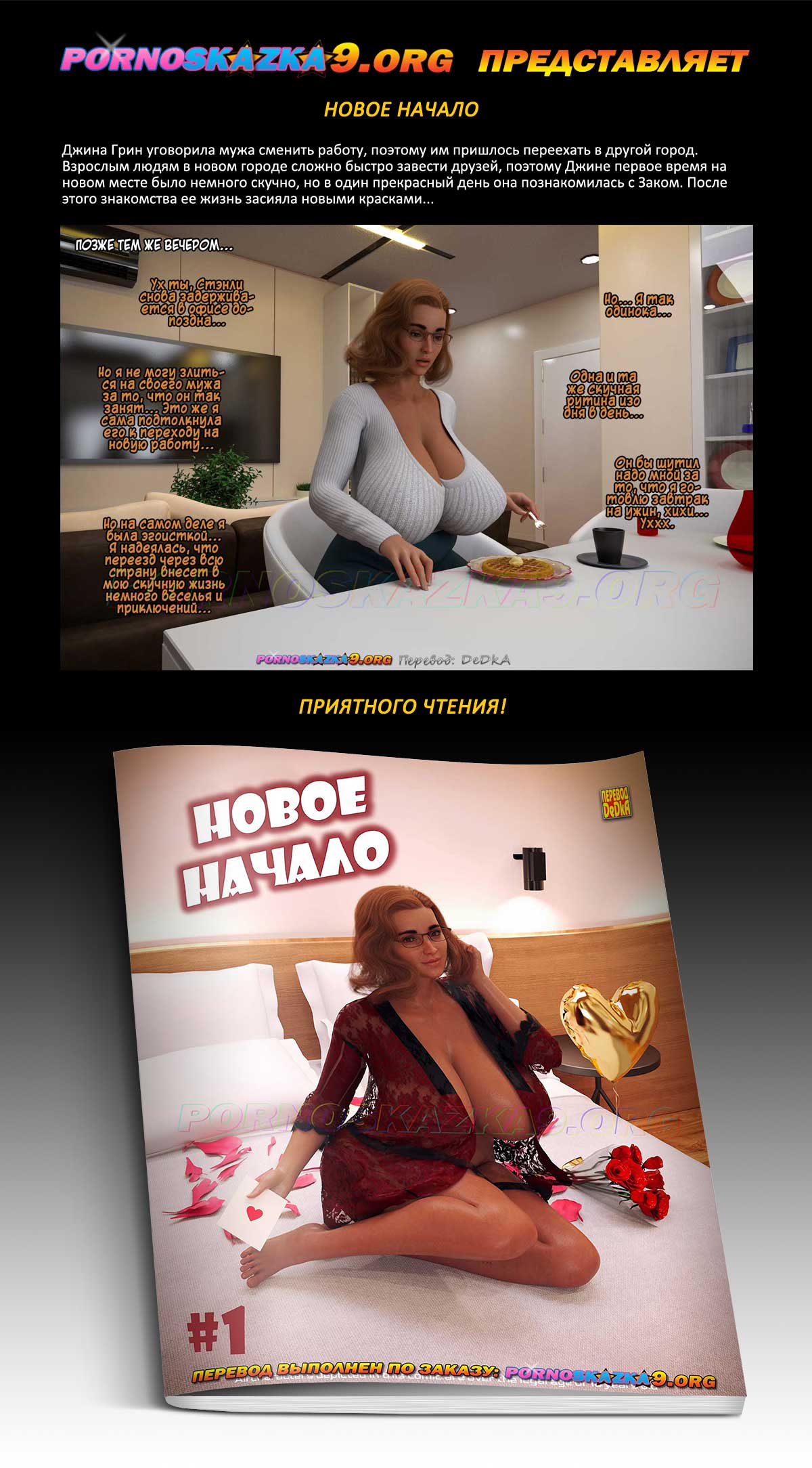 Порно комикс «Новое начало. Часть 1.» Джина Грин уговорила мужа сменить работу, поэтому им пришлось переехать в другой город. Взрослым людям в новом городе сложно быстро завести друзей, поэтому Джине первое время на новом месте было немного скучно, но в один прекрасный день она познакомилась с Заком. После этого знакомства ее жизнь засияла новыми красками…